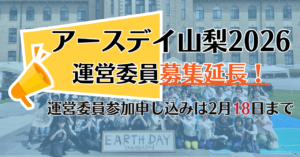1.はじめに 地球のことを考え、行動する日「アースデイ」。 2026年春、山梨県甲府市を舞台に「アースデイ山梨2026」を開催します。 「アースデイ山梨2026」は、想いを持った人たちが集まり、一緒につくっていきます。 […]